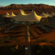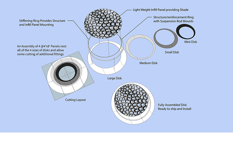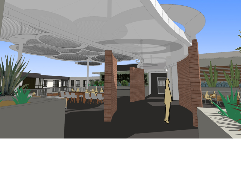 Solution: Created a sheltered canopy to the west and open overhead space to the east. This gathering space creates spectacular afternoon and sunset views, with open star gazing to the east. An undulating trellis covered walkway connects the two wings of apartments while influencing circulation to its two open spaces, this promotes air current and comfort. The 4 piece nested and repeated patterned metal panels create a swift fabrication strategy that could be easily budgeted and quoted.